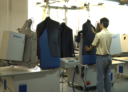運(yùn)用高品質(zhì)的德國BRISAY立模整燙機(jī),采用電腦控制蒸汽輸出量、溫度、壓力、定型、抽濕時間,根據(jù)面料的厚薄、質(zhì)地、性能,以38種不同整燙程序調(diào)整以上各個參數(shù),配合服裝的整燙。